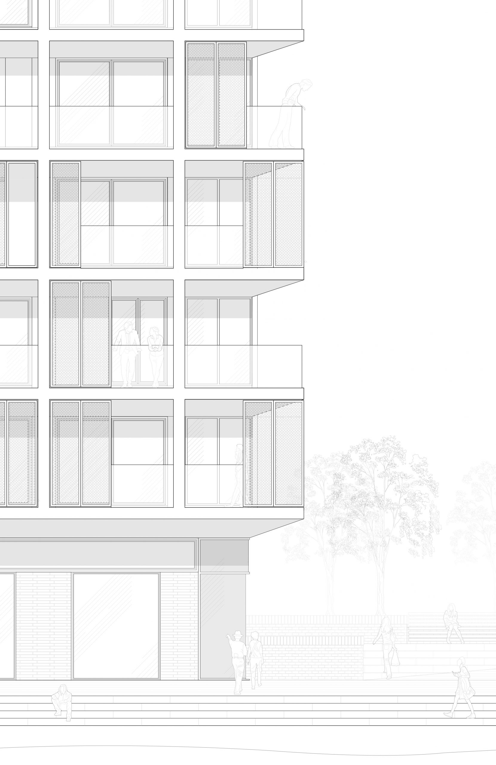 Expressing the linear form of the two blocks, expressed floor slabs provide the opportunity for a continuous ribbon of balconies to wrap around the building, articulated with white concrete structure, frameless glass balustrades and mesh screens which gives varying combinations of expansive views and privacy.