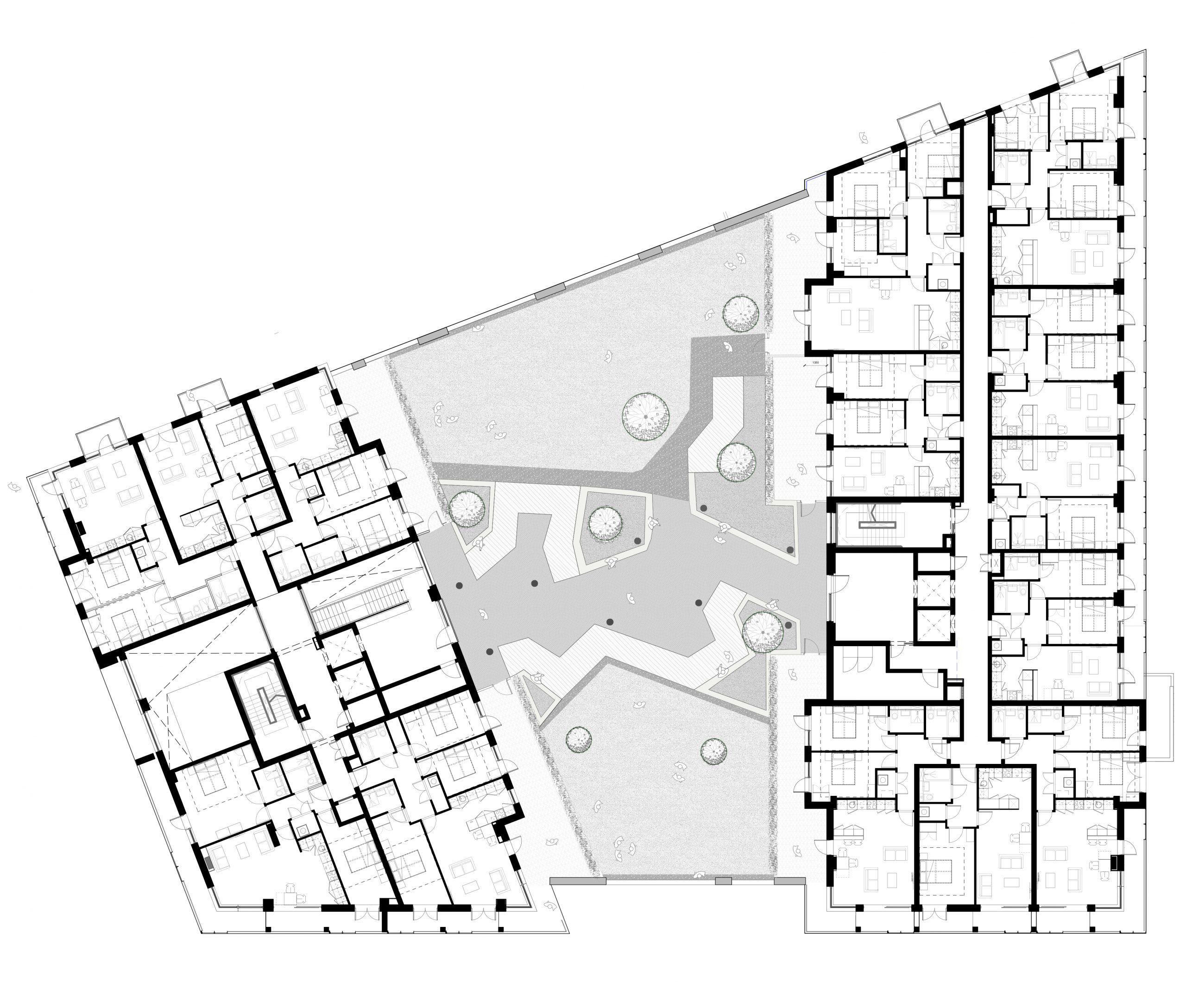 Sitting within a landscape focussed masterplan, the building forms a focal point along a new pedestrian promenade route where activity spills out from the ground level retail and commercial units.