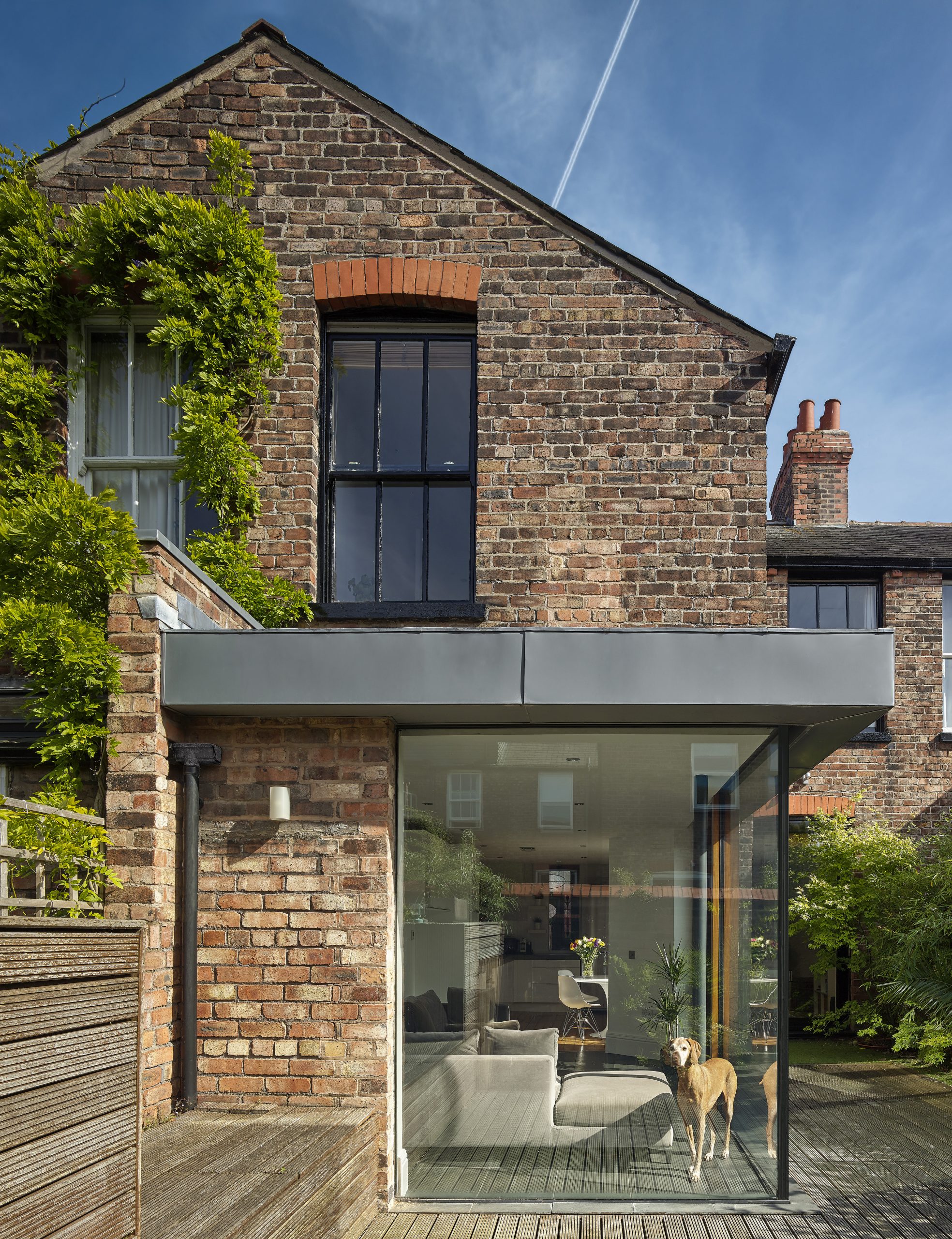 A landscaped courtyard garden flows from the floor to ceiling glazed garden room.