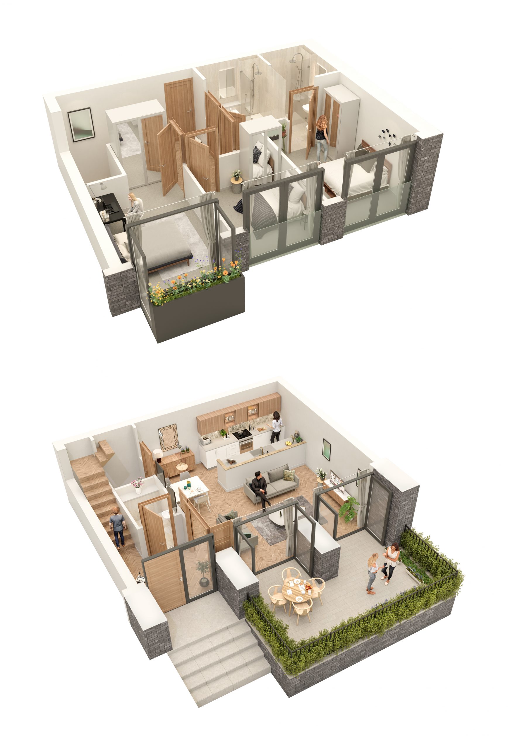 The scheme includes 60 street facing townhouses each with their own front door and stepped entrance from street level. The raised garden space provides privacy whilst giving life, animation and casual surveillance to the street. Level access is provided at first floor level from within the main building. The apartments have many variations across the scheme, reflecting and making the most of the geometry of the buildings and of the site. The varying geometries enhance the opportunity for views, outlook, daylighting and animation of the building facades. Extensive glazing provides light filled rooms and unbroken city views from Penthouse level. The apartments and town houses have all been designed to meet or exceed the National Space Standards and all feature either private balconies, terraces or gardens.