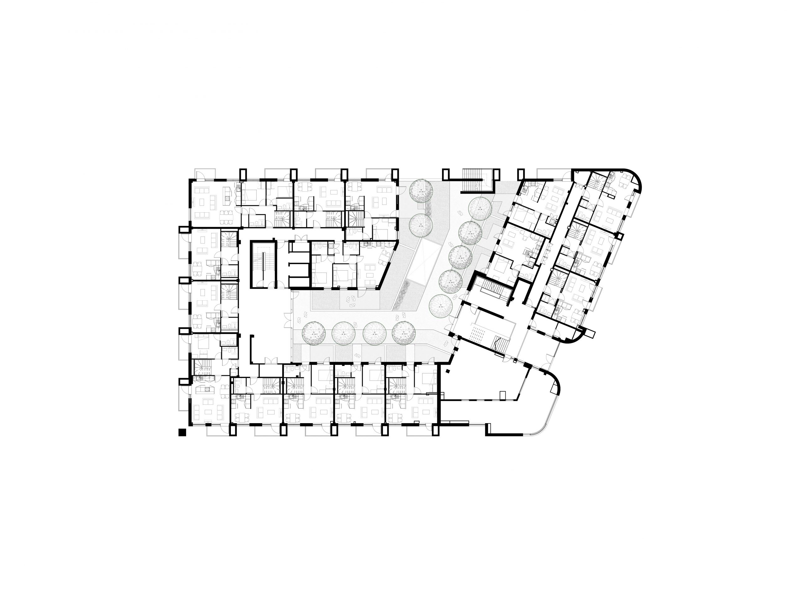 The continuity of materials and detailing across the two blocks unifies the scheme. A two storey brick plinth forms the base of the main elevation incorporating townhouses and the building entrance. The brickwork at lower level links the main block back to the rest of the scheme while curved brickwork walls guide pedestrians around the edge of the building and towards the double height, prominent main entrance. Two storey townhouses to all street frontages each with their own front door and defensible space provide activity to the surrounding streets. This compliments the car parking which is concealed in a basement and ground floor car park below the landscaped courtyard.